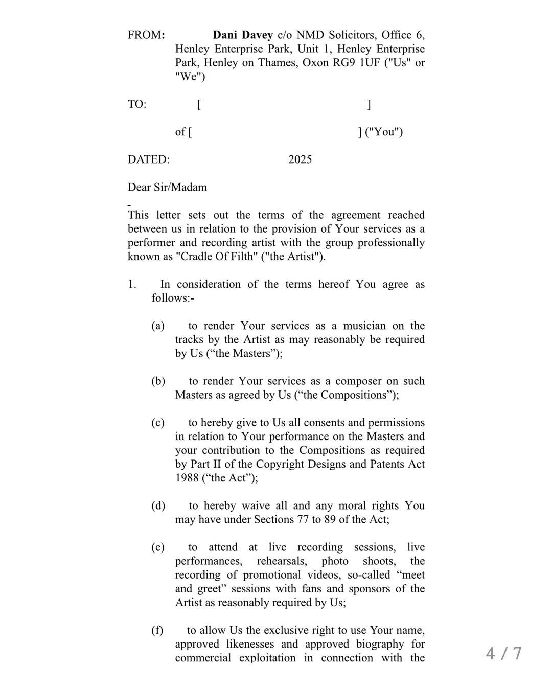 Η απάντηση του Dani Filth δόθηκε με στόμφο εκπροσώπου τύπου υπουργείου (αλλά με περισσότερο eyeliner). Ισχυρίστηκε πως το συμβόλαιο δεν είχε σταλεί για υπογραφή όπως ήταν, αλλά ήταν απλώς ένα «πρότυπο», μια πρόταση συζήτησης, μια «πρόχειρη σκιαγράφηση». Μια παρεξήγηση, δηλαδή. Κάτι σαν να σου φέρνουν το προγαμιαίο σύμφωνο και να γράφει: «Θα πλένεις τα πιάτα, θα μένεις σπίτι, θα μου λες πάντα ‘ναι’ και θα πληρώνεις κι από πάνω. Αλλά μωρό μου, μη δίνεις σημασία, είναι απλώς... προσχέδιο».