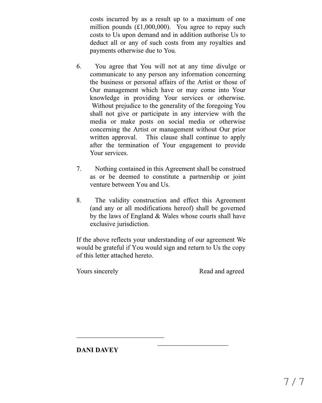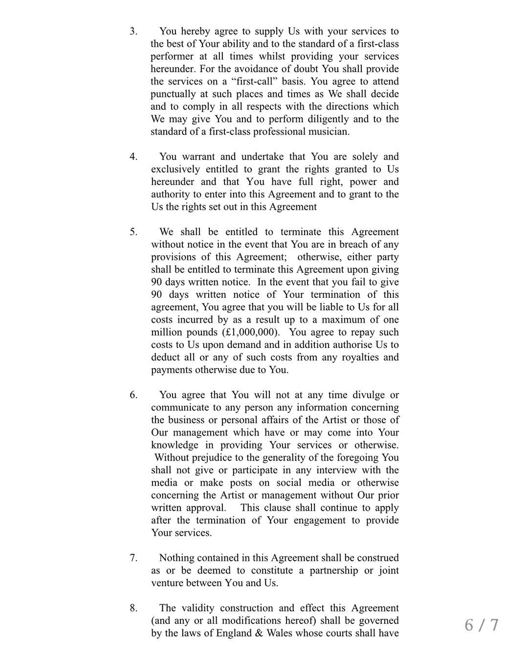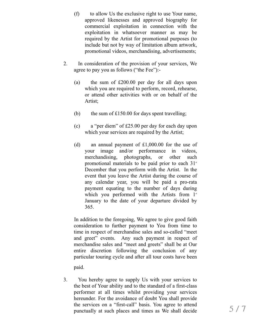 Το συμβόλαιο προέβλεπε, μεταξύ άλλων: 200 λίρες τη μέρα για εμφανίσεις, 150 για τις μέρες ταξιδιού, ρήτρα πρόωρης αποχώρησης με πρόστιμο έως και 1.000.000 λίρες, και απαιτούσε την αποκλειστική σου παρουσία για ό,τι χρειαζόταν η μπάντα. Εν ολίγοις: πλήρης απασχόληση, χωρίς πλήρη αμοιβή, με τιμωρία αν τολμήσεις να κάνεις κάτι άλλο για να μπορείς να γεμίσεις το αδειανό πιάτο στο τραπέζι σου.