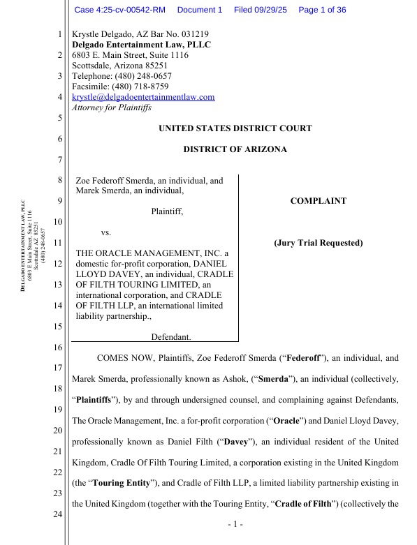 Στις 29 Σεπτεμβρίου η Zoe κατέθεσε αγωγή (βλ. εικόνα) στα δικαστήρια της Αριζόνα εναντίον της Oracle Management, Inc., της εταιρείας που μανατζάρει τους Cradle of Filth αλλά και εναντίον του Daniel Lloyd Davey, γνωστού ως Dani Filth. Το έγγραφο είναι «φωτιά» διότι συνοδεύεται από πλούσιο φωτογραφικό υλικό με αποδείξεις για όσα ισχυρίζεται το ζευγάρι των μουσικών, που έφυγαν κακήν κακώς από τους Cradle of Filth. Αξίζει να το διαβάσετε…