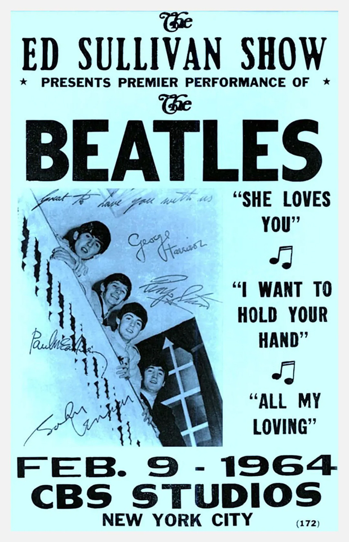 Οι Beatles εμφανίστηκαν στην εκπομπή The Ed Sullivan το 1964, διαδίδοντας την Beatlemania, καθώς τον προηγούμενο χρόνο, δημιουργήθηκε ένα εμβληματικό κομμάτι των Beatles με τη μορφή αφίσας.