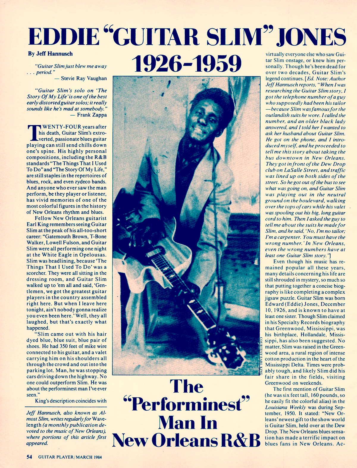Γεννημένος το 1926 στο Greenwood του Μισισιπή και μεγαλωμένος μέσα στη σκληρή καθημερινότητα του Δέλτα, ο Eddie Jones ξεκίνησε ως χορευτής. Πριν καν πιάσει κιθάρα, ήξερε τι σημαίνει performance. Τα παρατσούκλια του ήταν “Limber Leg Eddie”, και “Rubber Legs”. Μετά τη θητεία του στον Β’ Παγκόσμιο Πόλεμο, η κιθάρα μπήκε στη ζωή του. Στη Νέα Ορλεάνη, μέσα σε house parties και δρόμους γεμάτους από R&B, ο Jones μεταμορφώθηκε σε Guitar Slim και άρχισε να ωθεί την ηλεκτρική κιθάρα εκεί που κανείς άλλος δεν τολμούσε.
