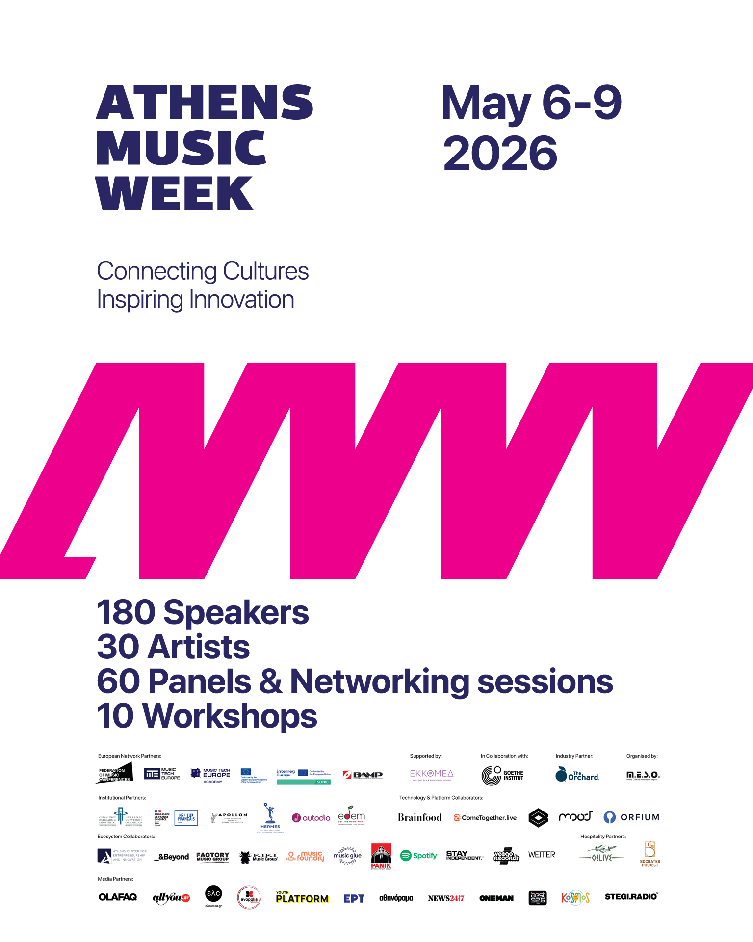 Το πρόγραμμα του AMW 2026 συγκεντρώνει ένα ευρύ φάσμα θεματικών, από τη μουσική τεχνολογία και το σύγχρονο μουσικό οικοσύστημα έως την ηλεκτρονική μουσική και την εκπαίδευση, δημιουργώντας έναν ενιαίο χώρο διαλόγου και ανταλλαγής γνώσης. Καλεσμένοι ομιλητές όπως ο Gérôme Vanherf, Co-Founder και CEO της ikii.studio, η Anna Zo, Πρόεδρος του Music Tech Europe, καθώς και ο βραβευμένος δημιουργός, σεναριογράφος και παραγωγός έργων XR, θεάτρου και κινηματογράφου Oliver Czeslik, μεταφέρουν σύγχρονες προσεγγίσεις γύρω από τη δημιουργικότητα, την τεχνολογία και την αξιοποίηση της τεχνητής νοημοσύνης στη μουσική και τα δημιουργικά πεδία. Παράλληλα, ο Robert Meijerink, επικεφαλής booking του Eurosonic Noorderslag, η Ruth Koleva (SoAlive Music Conference) και ο Dino Lupelli (Federation of Music Conferences) μοιράζονται την εμπειρία τους από τα σημαντικότερα ευρωπαϊκά showcase festivals, ενώ ο Niko Michault (PUSH Management) και ο Christian Cleret (Dionysiac Tours), με πολυετή πορεία στη διεθνή ανάπτυξη καλλιτεχνών και φεστιβάλ, ανοίγουν τη συζήτηση γύρω από τη σχέση δημιουργικότητας, αγοράς και διεθνούς δικτύωσης.