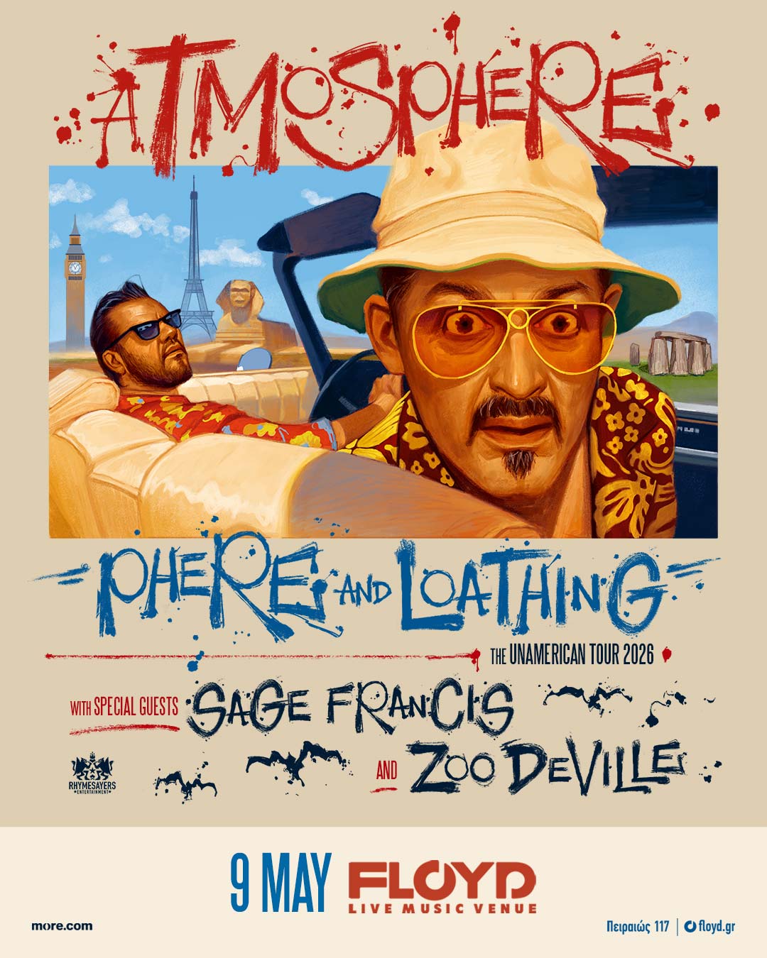 Οι Atmosphere έρχονται στην Αθήνα για μία εμφάνιση αντάξια της φήμης τους, το Σάββατο 9 Μαΐου, στο Floyd Live Music Venue! Το επιδραστικό hip-hop ντουέτο από τη Μινεάπολη θα βρεθεί για πρώτη φορά στη χώρα μας, σε μια ιστορική βραδιά που οι οπαδοί τους περίμεναν εδώ και χρόνια. Μαζί τους στη σκηνή ο σπουδαίος Sage Francis και ο ανερχόμενος ZooDeVill.